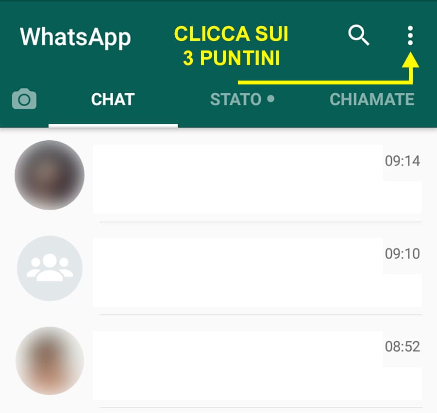 Apri la sezione delle chat su WhatsApp e clicca sui tre puntini che si trovano in alto a destra