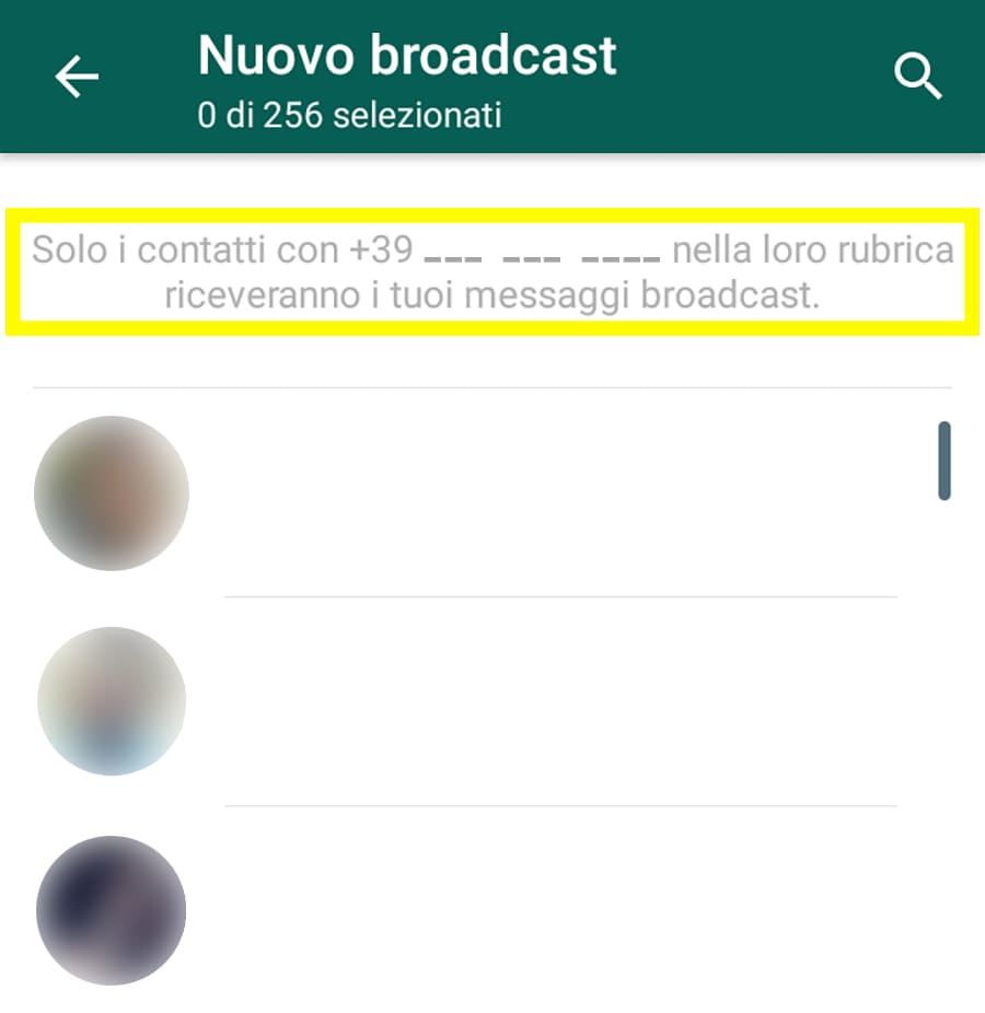 - limite massimo di partecipanti 256 (se vuoi inviare lo stesso messaggio a molte altre persone, basterà semplicemente che crei un'altra lista!)